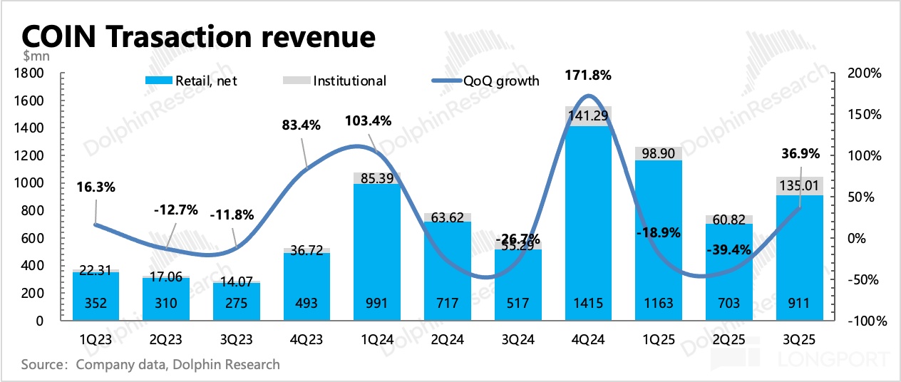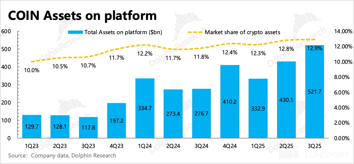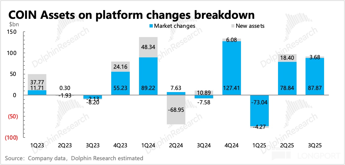 In terms of asset scale, the customer asset scale on the platform continued to hit a new high in Q3, reaching $522 billion, including segregated custody funds, with a 21% quarter-on-quarter growth. However, Dolphin Research's simple calculation shows that the increase in asset scale mainly relied on the appreciation of existing assets (Ethereum outperformed Bitcoin this quarter, with the highest increase), with only 10% of the increment coming from new external deposits.