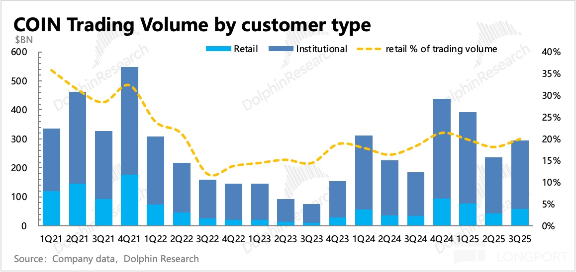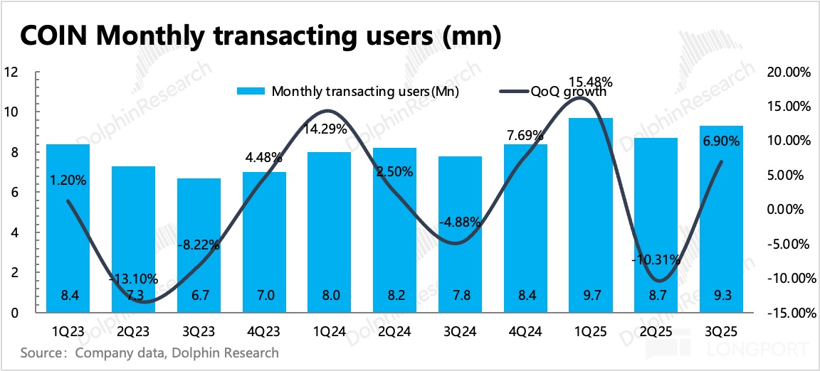 In Q3, the market value of cryptocurrencies hit a new high again, and trading volume saw a quarter-on-quarter recovery. The industry's average daily trading volume grew by 44% quarter-on-quarter, but Coinbase only grew by 25% quarter-on-quarter.
