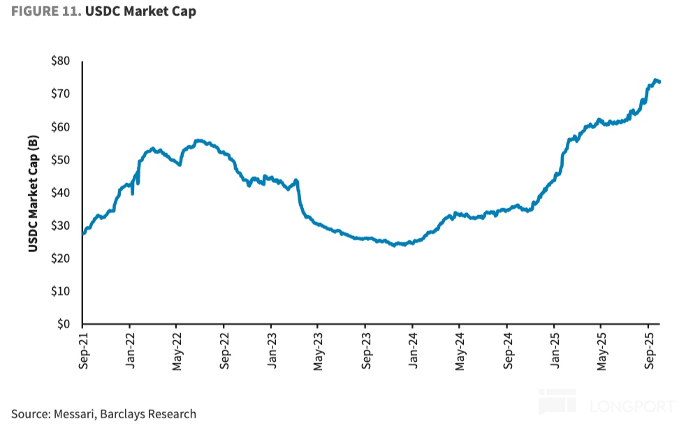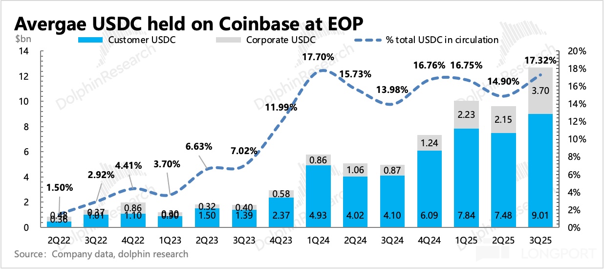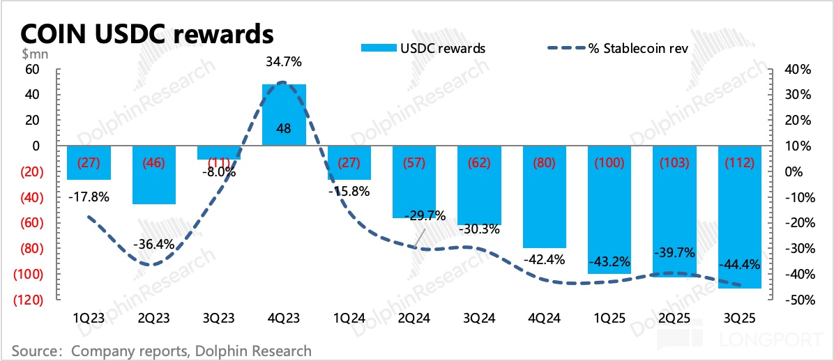 (1) The main drag on growth was stablecoin revenue, where the yield decline due to interest rate cuts was the main reason. The total USDC in circulation at the end of the period reached $74 billion, with Coinbase's platform holding (customers + company) at the end of Q3 being $12.7 billion, accounting for 17%, with a net increase of $3 billion quarter-on-quarter. The proportion of USDC incentives given to users by Coinbase in Q3 also increased.
