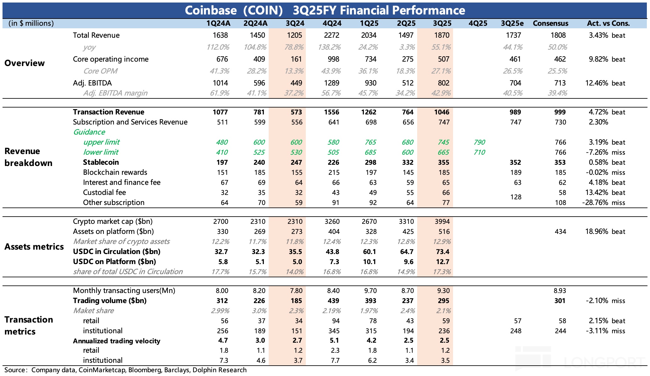 (The "3Q25e" column in the chart below represents the institutional expectations disclosed by Coinbase the day before the financial report)
