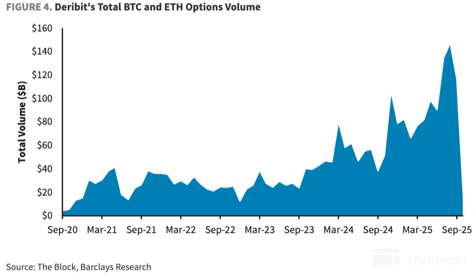 However, with the formal integration of Deribit, Coinbase is expected to fill this natural gap through derivatives trading, driving market share recovery. As shown in the chart below, the scale of derivatives trading in August and September was already significantly higher than before.