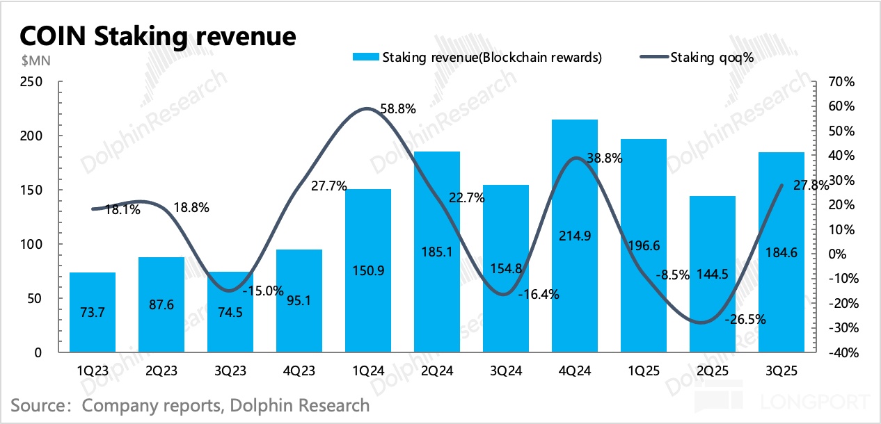 Therefore, subscription revenue grew by 14% quarter-on-quarter, lower than the asset scale growth rate. In detail, the main drag on growth was stablecoin revenue, where the yield decline due to interest rate cuts was the main reason. However, staking revenue increased as the average staking yield improved due to the significant rise in Ethereum (ETH) in Q3.