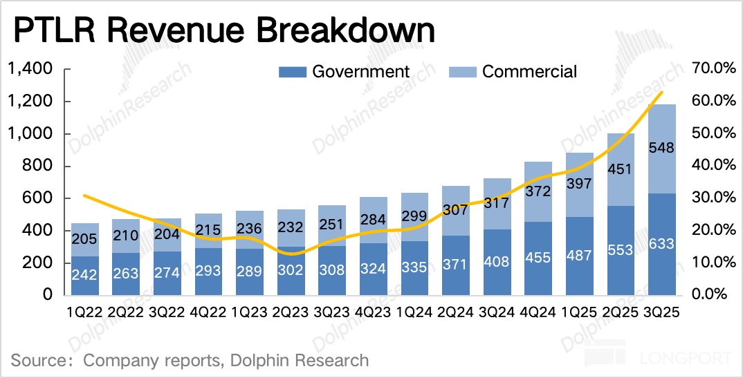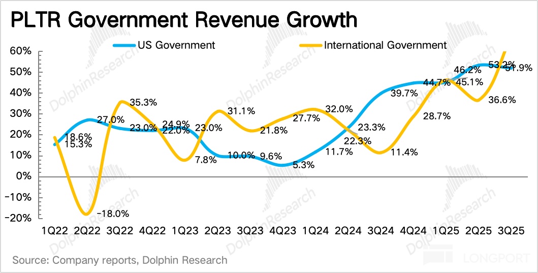 2. International government revenue accelerates: Government revenue grew 55% year-on-year in the third quarter, accelerating quarter-on-quarter. However, the growth rate of international government revenue exceeded that of the U.S. government, reflecting the gradual entry into the service cycle of contracts signed this year (NATO, UK, Germany, etc.).