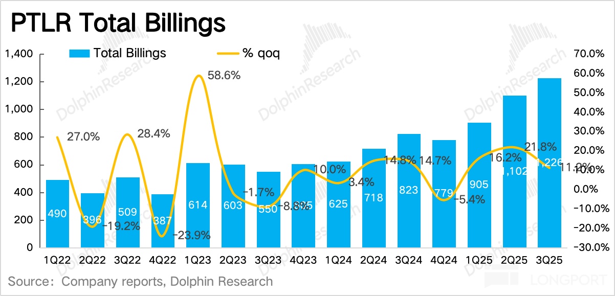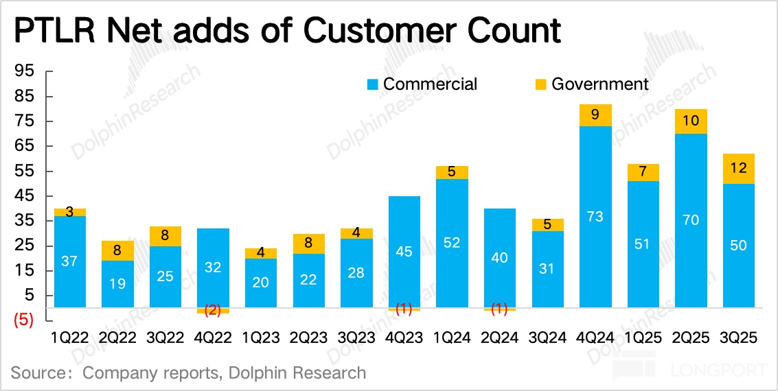 Therefore, the "signs of growth slowdown" revealed by the third-quarter operational indicators are likely the market's main concern. But Dolphin Research believes that ultimately it is still a valuation issue. In fact, for customized software like Palantir, whose product service cycle is measured in years and requires heavy upfront deployment work, seasonal fluctuations are normal.