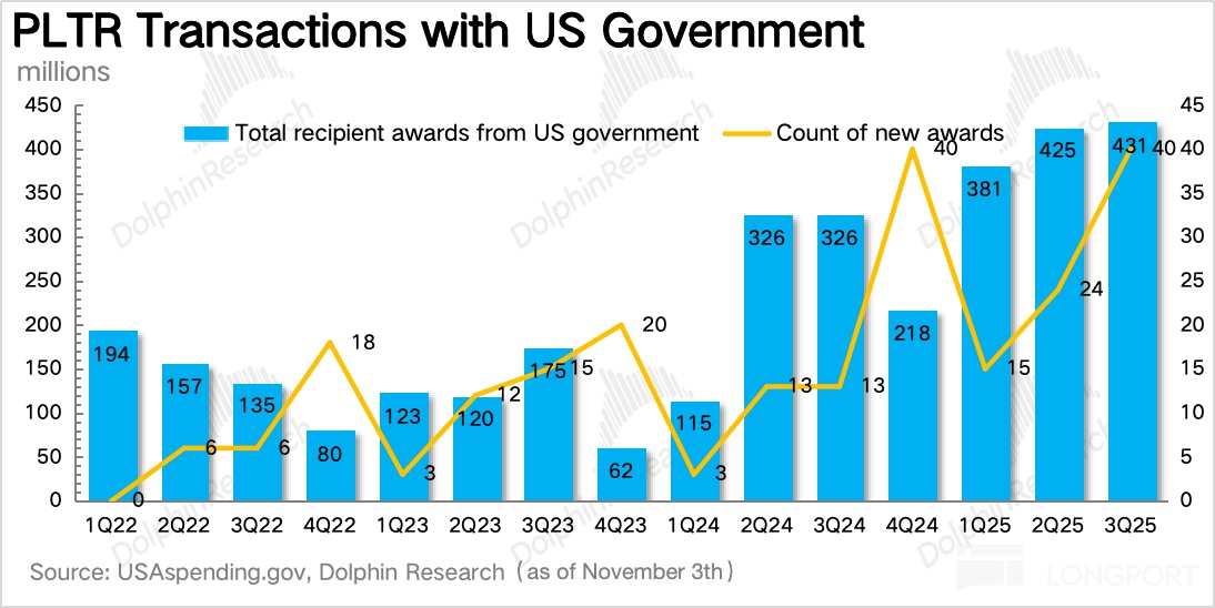 From the official budget details, Palantir's contract volume with the U.S. government remained full in the third quarter, including a $385 million contract signed with the Department of Veterans Affairs.