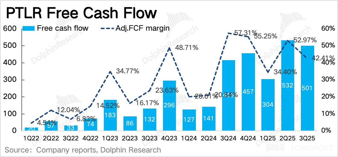Palantir's cash flow is related to contract payments, so there will be seasonal fluctuations. Although many new contracts were added in the third quarter, accounts receivable increased significantly, affecting the actual cash inflow for the period. Management's full-year guidance for cash flow is $1.9-2.1 billion, assuming a 50% growth rate in cash flow next year, the current EV/FCF=160x valuation is still high, implying too many positive expectations—sustained high growth + maintaining extreme operational efficiency.
