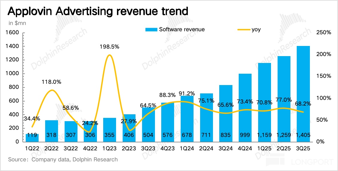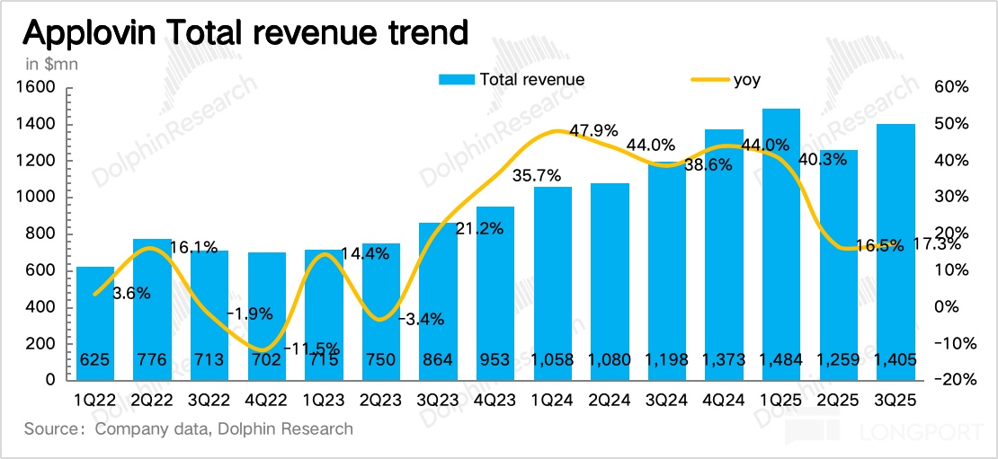 In the third quarter, AppLovin achieved total revenue of $1.405 billion, a year-on-year increase of 17%, exceeding consensus expectations. Excluding the impact of the divestiture of the 1P gaming application, the advertising year-on-year growth rate was 68%, showing a natural slowdown compared to 77% in the previous quarter.