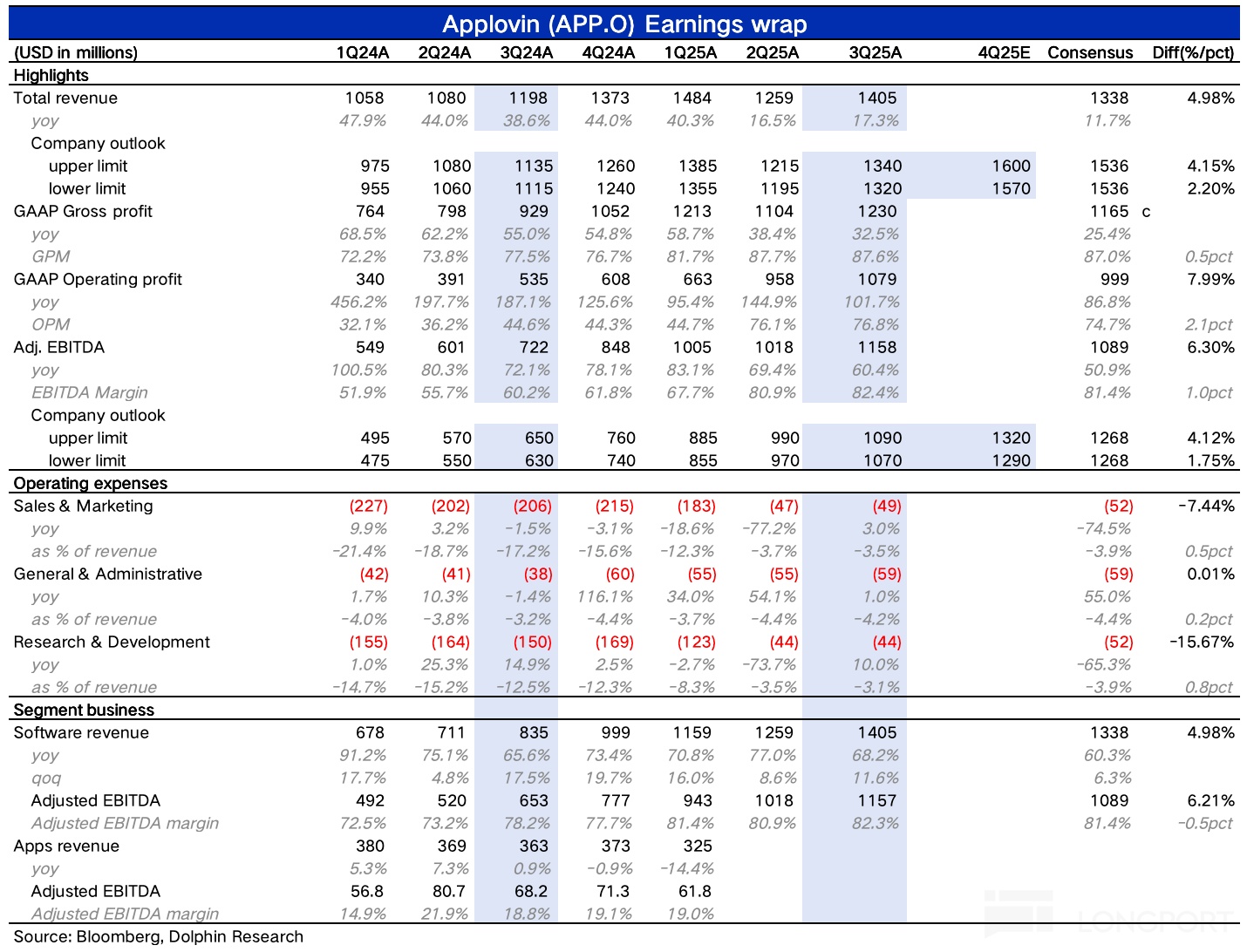 $AppLovin(APP.US) released its Q3 2025 financial report after the U.S. stock market closed on November 6th, Eastern Time. The results slightly exceeded consensus expectations, including current revenue growth and margin optimization, as well as guidance for Q4.