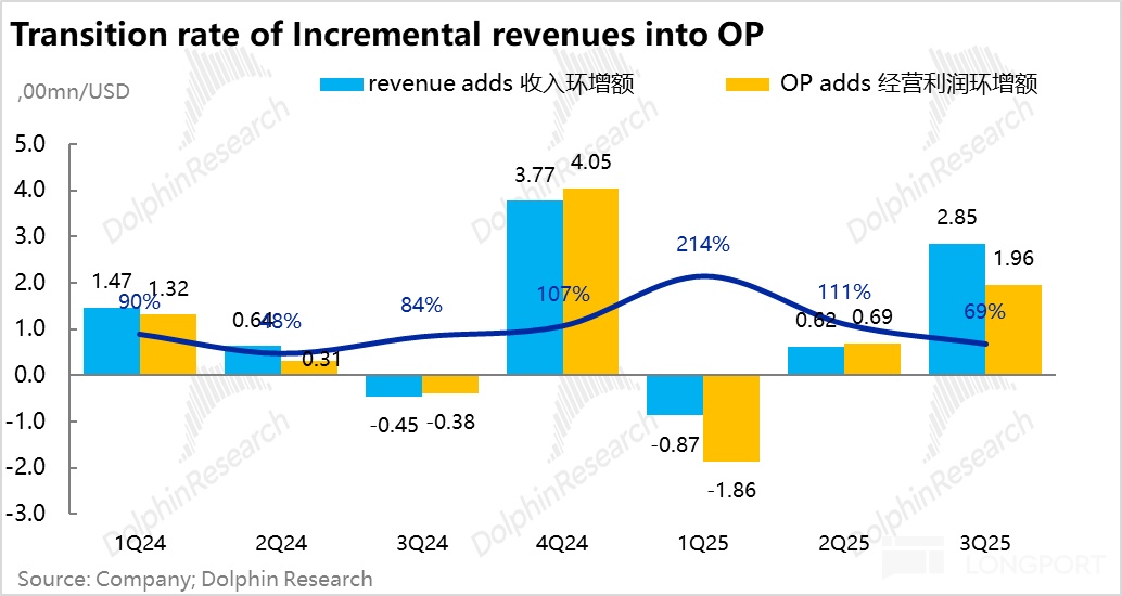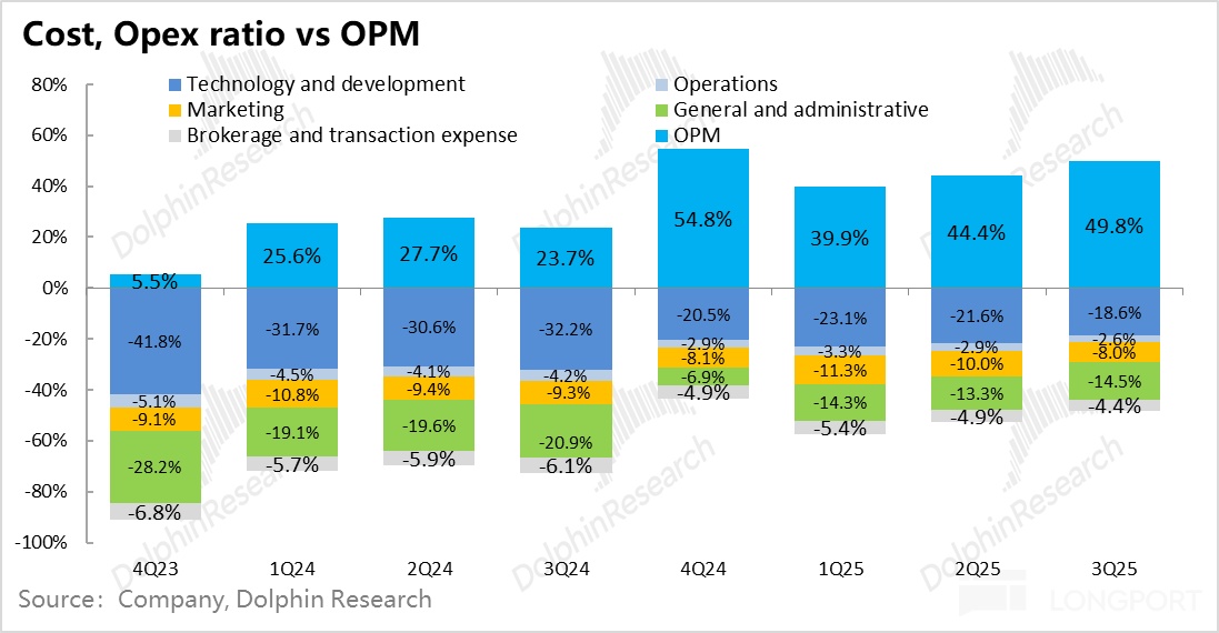 With a nearly 30% quarter-on-quarter revenue growth, expenses only increased by 16%, and this includes the additional salary tax triggered by the rise in stock prices and CEO management incentives. Excluding this factor, Dolphin Research roughly estimates that its expense growth in the third quarter may be only about 6%.