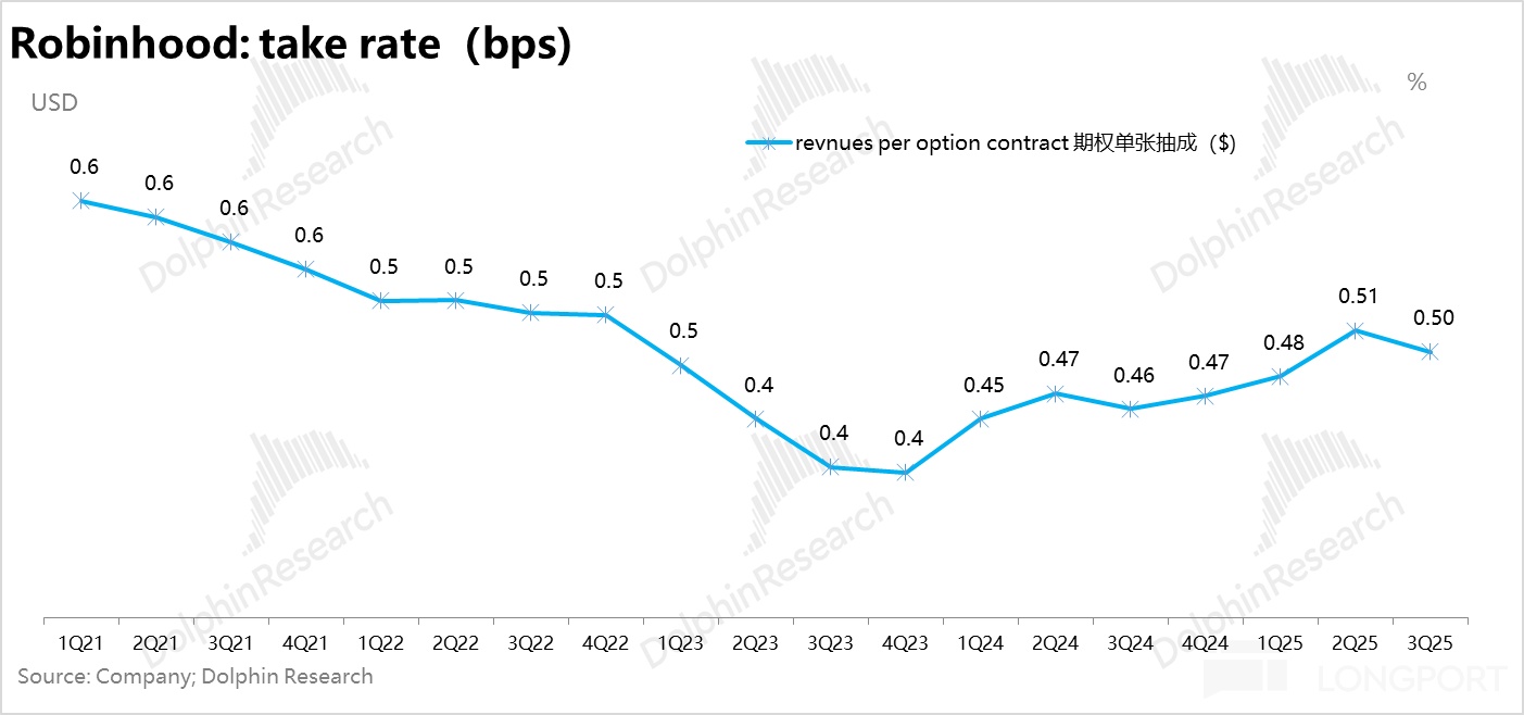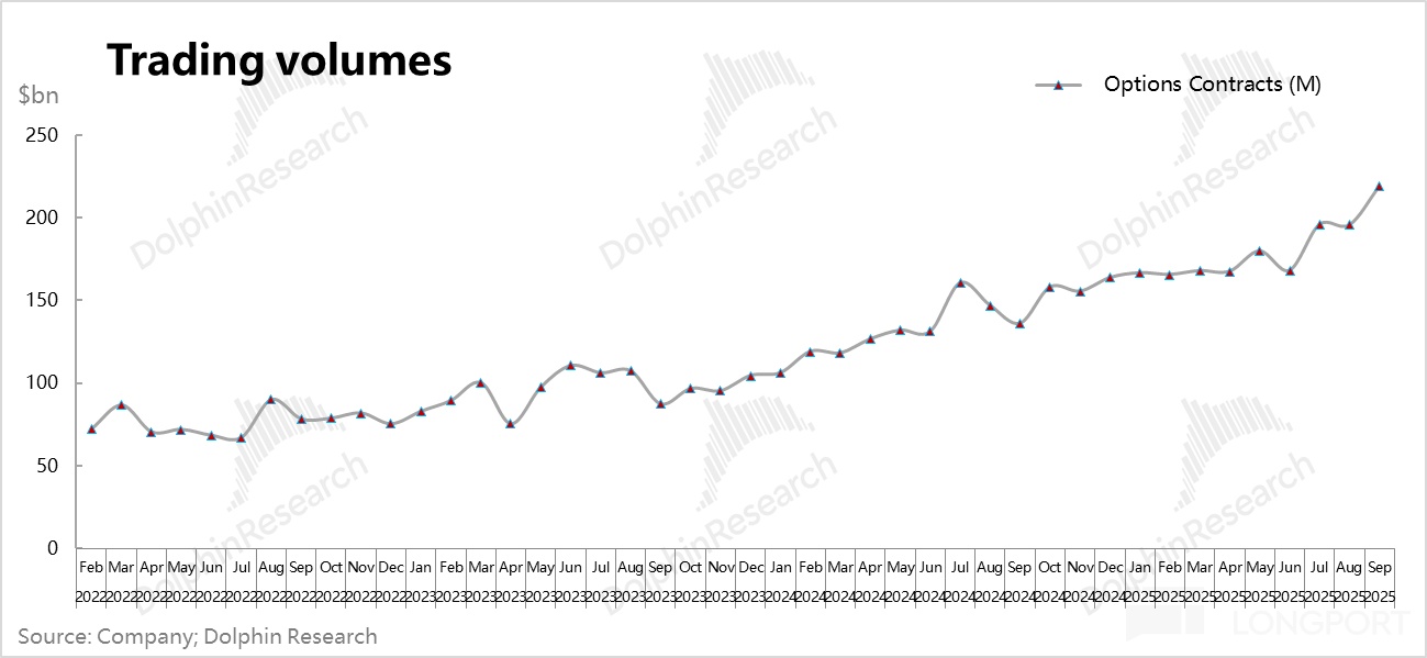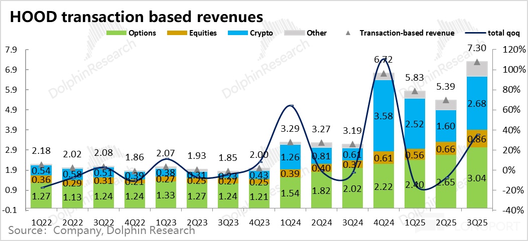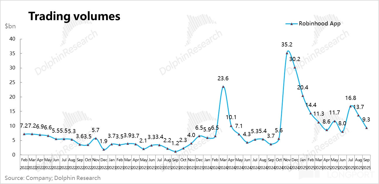 As the largest contributor to trading revenue, the options business brought in $300 million in the third quarter, with a further 15% quarter-on-quarter growth; with known options trading volumes (of course, HOOD's market share in options is still continuously rising), it was completely in line with market expectations.