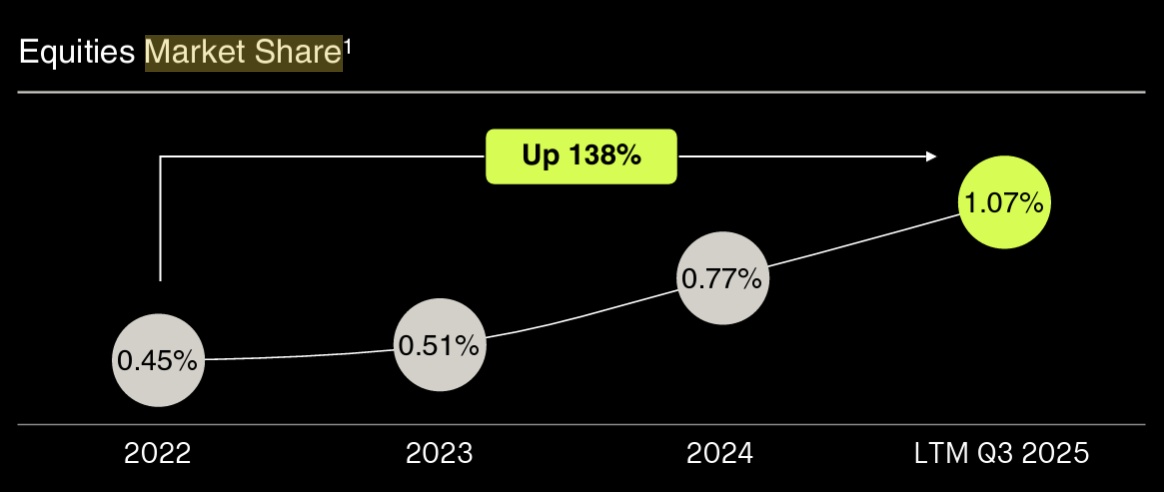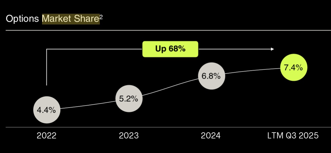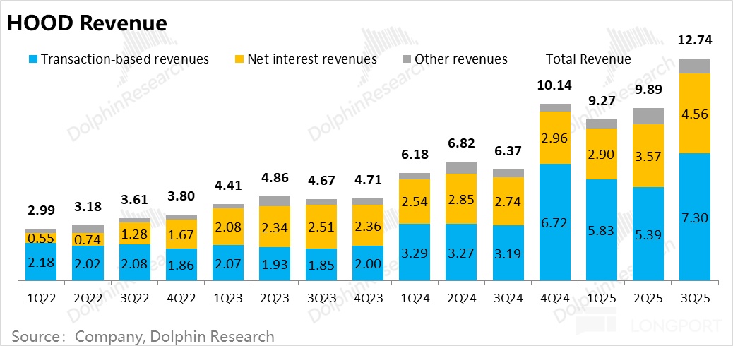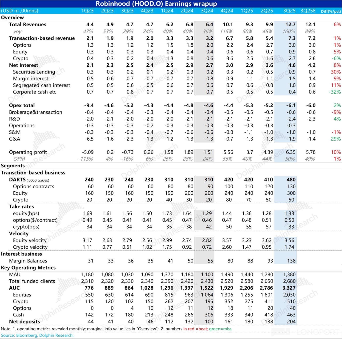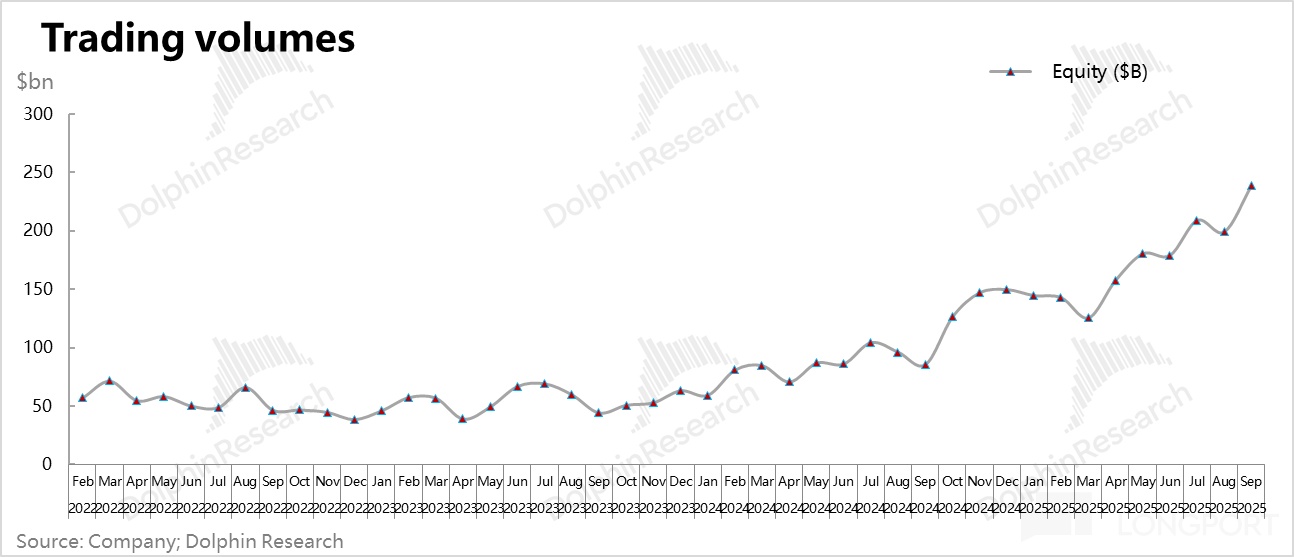 As the largest contributor to trading revenue, the options business brought in $300 million in the third quarter, with a further 15% quarter-on-quarter growth; with known options trading volumes (of course, HOOD's market share in options is still continuously rising), it was completely in line with market expectations.