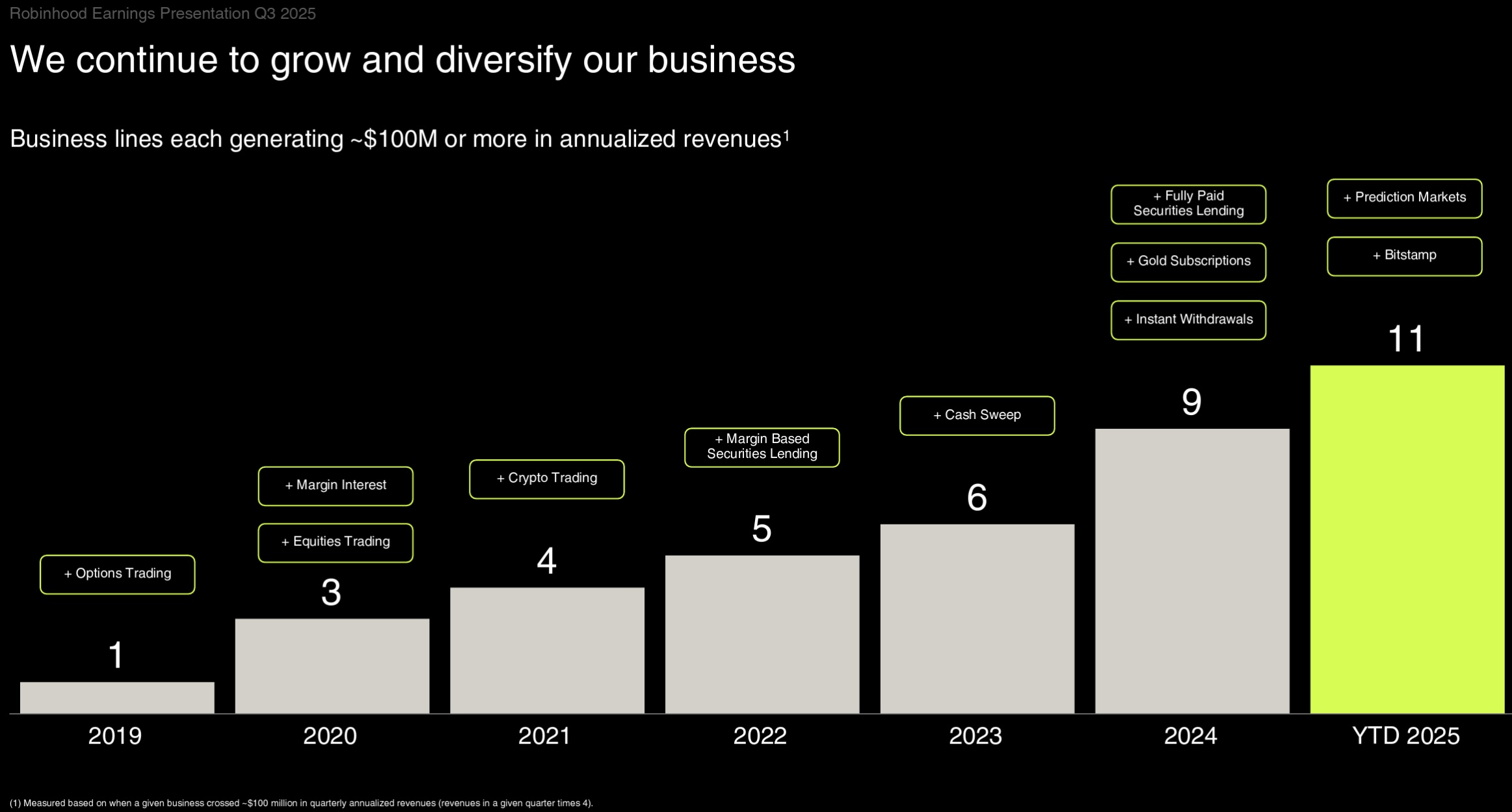 Since its launch, Robinhood's event prediction business has accumulated over 40 billion contract trades, with 20 billion contracts contributed in the third quarter alone, and it will be pushed to more markets in the future. Currently, about 100 prediction events are provided, and some brokerages estimate it can contribute $160 million next year.
