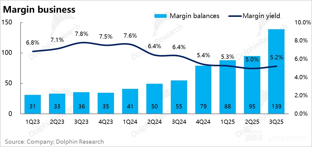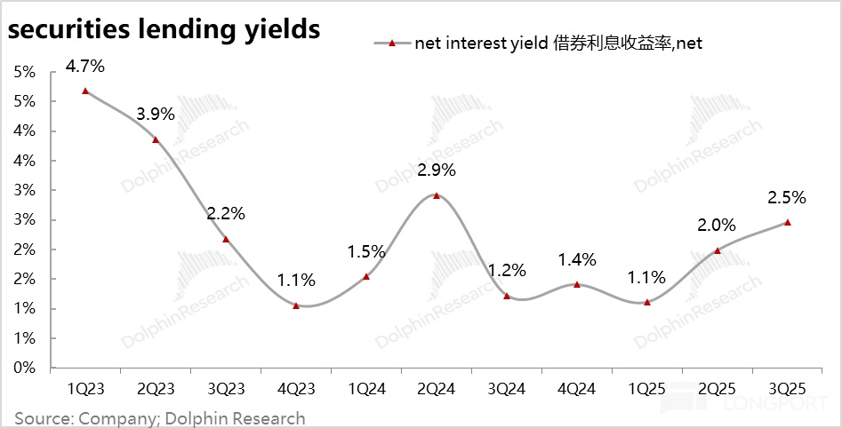 Dolphin Research calculates that the yield of the securities lending business in the third quarter was 2.5%, compared to the second quarter, there was an improvement; at the same time, the total scale of securities lent by the company also increased by 24% quarter-on-quarter. Volume and price rise drive a significant increase in securities lending income.