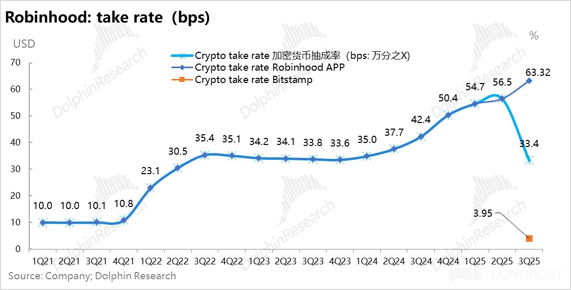 But its revenue was only $16 million, with a monetization rate of only 3.95 basis points (Coinbase's institutional business is about 6 basis points), so the overall monetization rate of Robinhood's virtual asset business was dragged down to 33 basis points.
