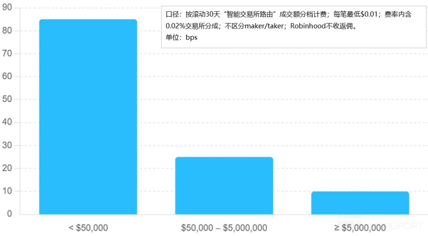Thirdly, Virtual Asset Monetization Rate Boosting Period: Currently, HOOD's virtual asset monetization has advanced to two paths: a. the original PFOF, approximately 85 basis points, equivalent to invisible charges to users; b. smart order routing: explicit charges to users, a non-order wholesale monetization model that eats order rebates, charging based on users' past 30-day trading volume, priced at 10–85 basis points.