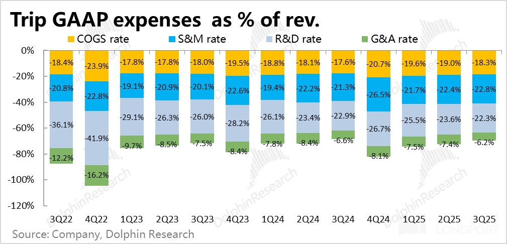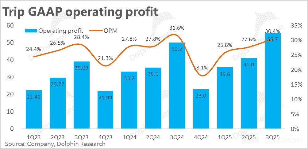 Under GAAP, due to the contraction phase of gross margin and the expansion phase of expenses, this quarter, Trip.com's GAAP operating profit margin narrowed by 1.2 percentage points year-on-year, with operating profit increasing by 11% year-on-year to 5.57 billion yuan.
