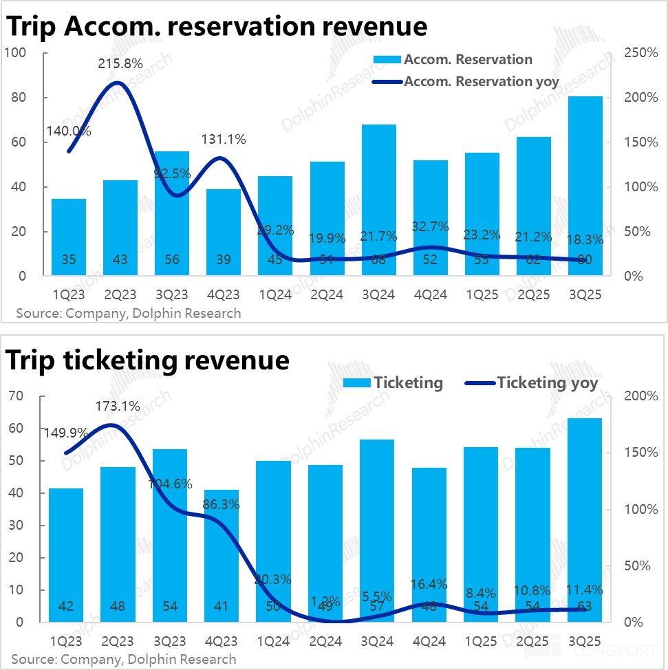 3. Among the two major pillar businesses, this quarter, hotel booking revenue increased by approximately 18% year-on-year, with a continued quarter-on-quarter slowdown of 3 percentage points, approaching the upper end of the company's previous guidance range of 14%-19%. Besides the impact of a high base, the average price per hotel room both domestically and internationally still shows a downward trend, which should also be one of the reasons dragging down revenue growth.