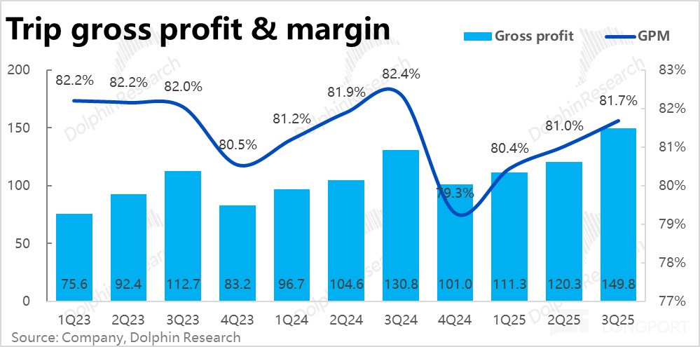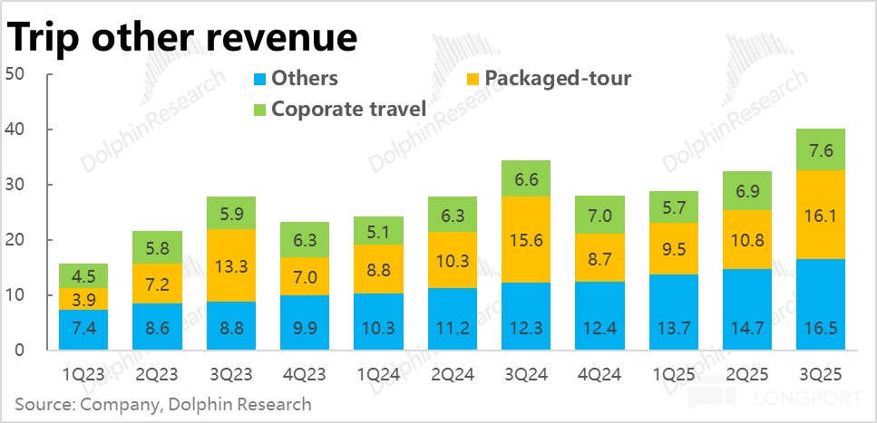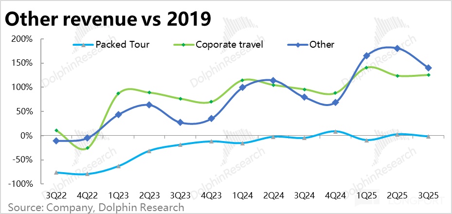 3) Other revenue, mainly from advertising, increased by 34% year-on-year, with growth accelerating by nearly 3 percentage points quarter-on-quarter, showing unexpectedly strong performance. The continued improvement in advertising penetration and the operation of Trip.com's platform in travel community functions such as strategy sharing and personal travelogues should continue to promote good growth in this part of the revenue.
