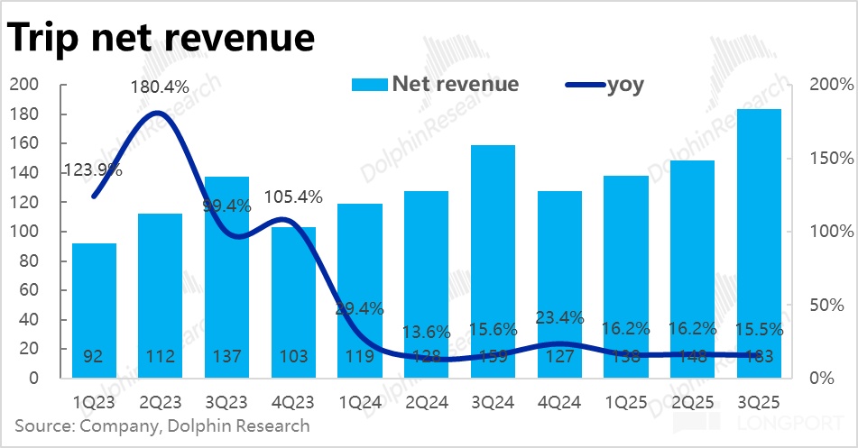This quarter, Trip.com Group's total net revenue was approximately 18.3 billion yuan (excluding business tax), representing a year-on-year increase of 15.4%, with the growth rate slightly slowing quarter-on-quarter but still slightly above the market expectation of 14.5%, indicating stable growth.