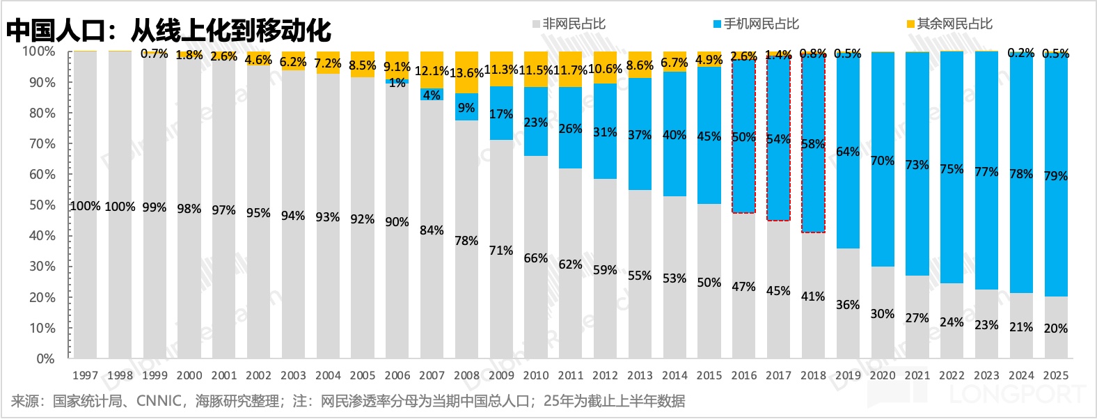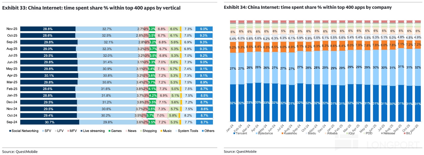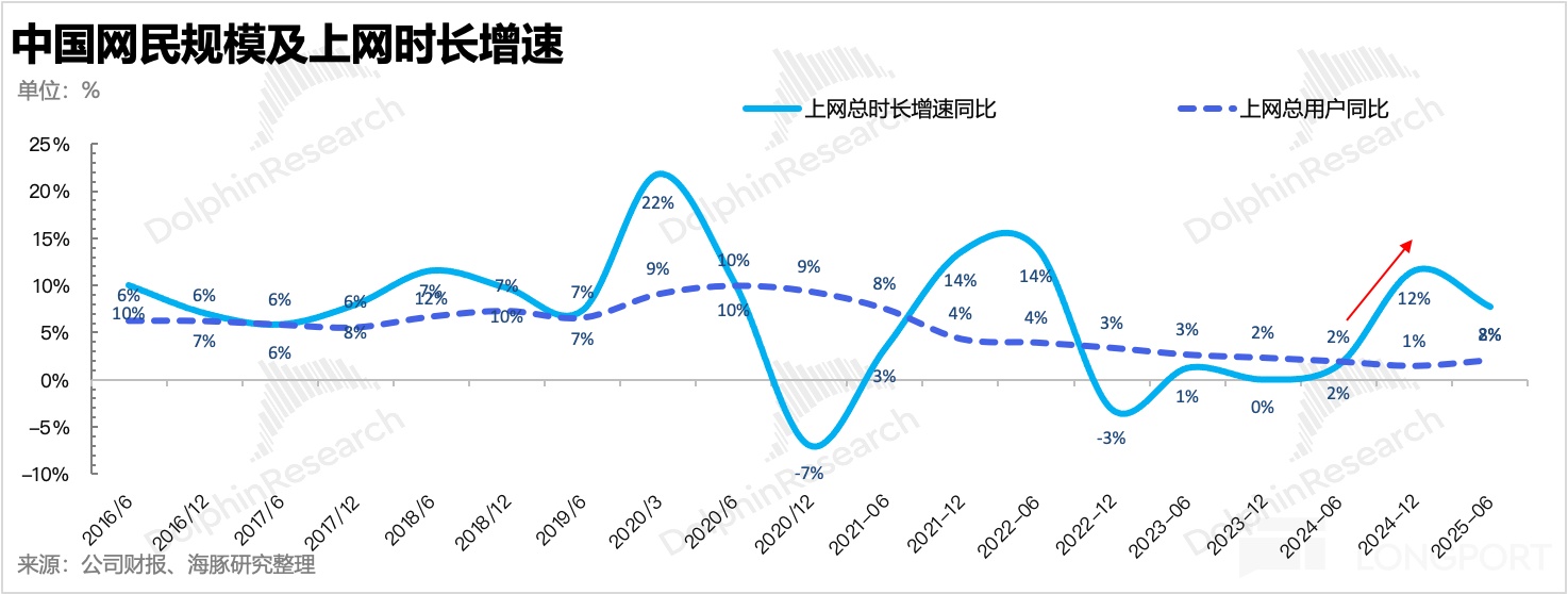 但这次 AI 是一种颠覆式的全新人机交互,用户感知端是一种体验升级,这在一定程度上推动疫情后转到线下的流量,又回归到了线上。2024 年下半年和 2025 年上半年,网民数、人均时长均出现了小幅激增。