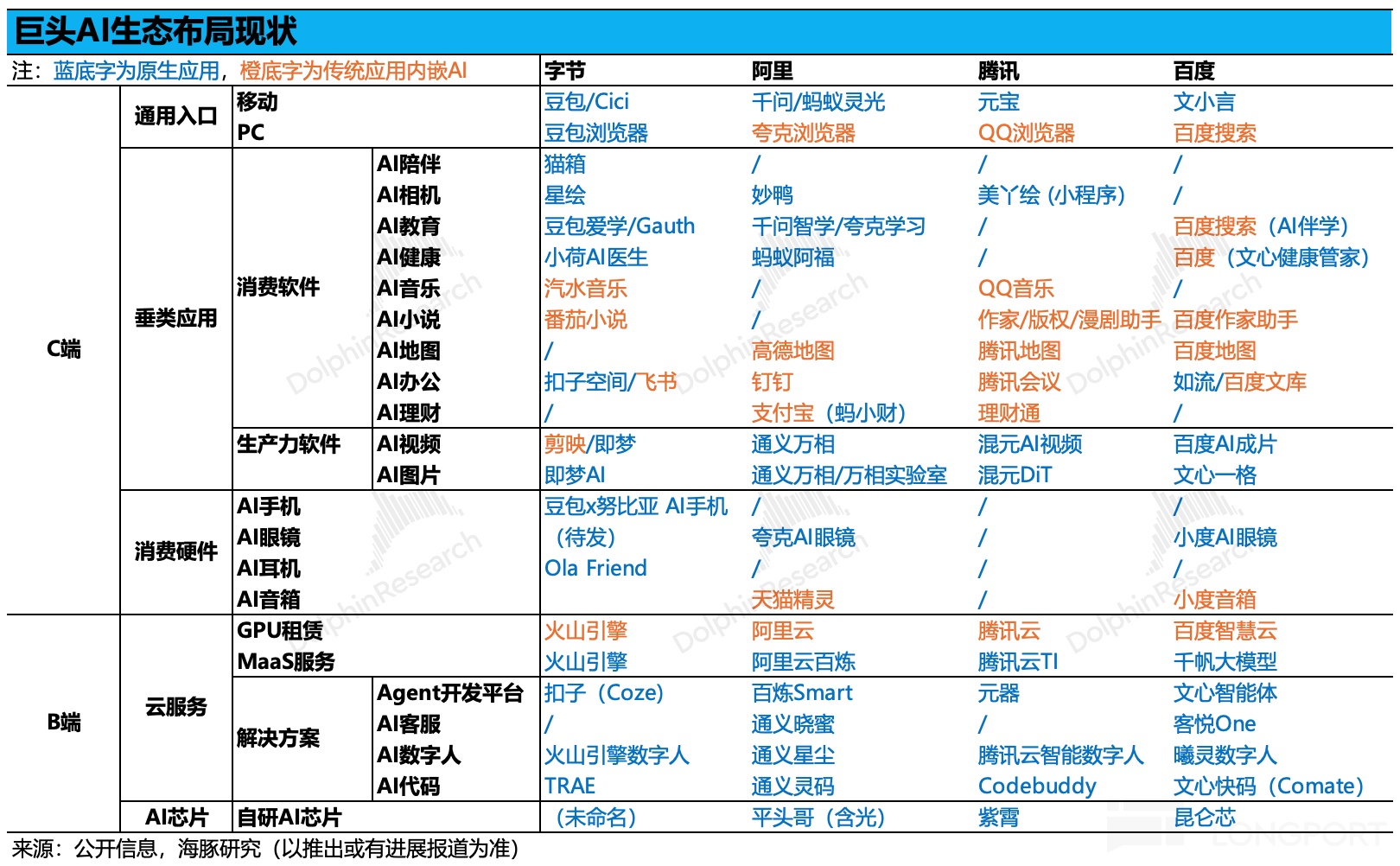 在二者短板都有明显改善,国外又有 ChatGPT 作为通用 to C AI 打样,海豚君认为一开始慢了半拍们的中国互联网巨头,到了 26 年 一场 AI APP 巨头乱战已经要一触即发。