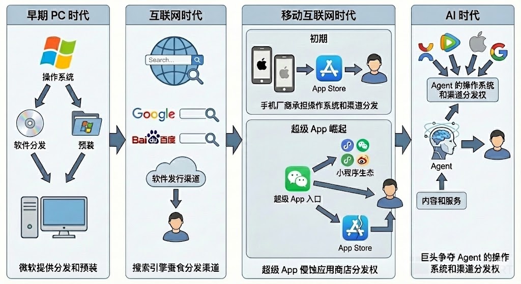 早期 PC 时代操作系统是微软,软件由微软提供分发和预装,随之互联网时代来临,谷歌、百度等搜索引擎分食了软件发行的渠道份额。等到进入移动互联网时代,苹果等手机厂商承担了操作系统和绝大部分渠道分发的功能。