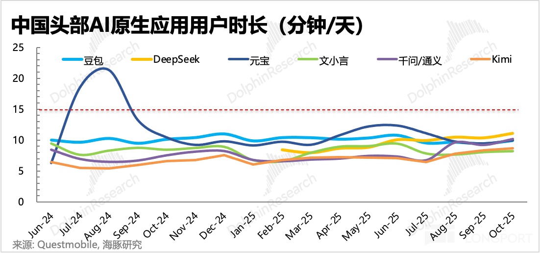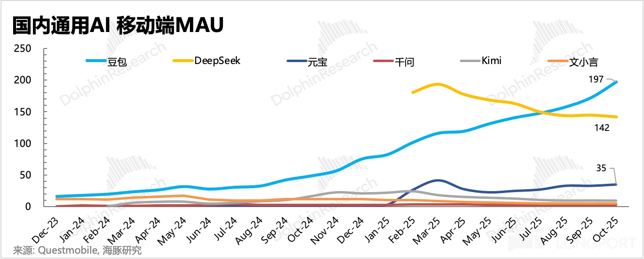 从用户规模(MAU)上看,豆包一骑绝尘占到 60%,DeepSeek 紧随其后占 30%;剩余的 10% 中,打头的是元宝,虽然月活只有豆包的 1/6,但是也能排到全国第三的位置。此外就是 11 月才开始真正发力的千问(下图数据仅到 10 月),根据官方数据报道,上线 23 天月活直接飚到 3000 万,一个多月用户增长近 10 倍。