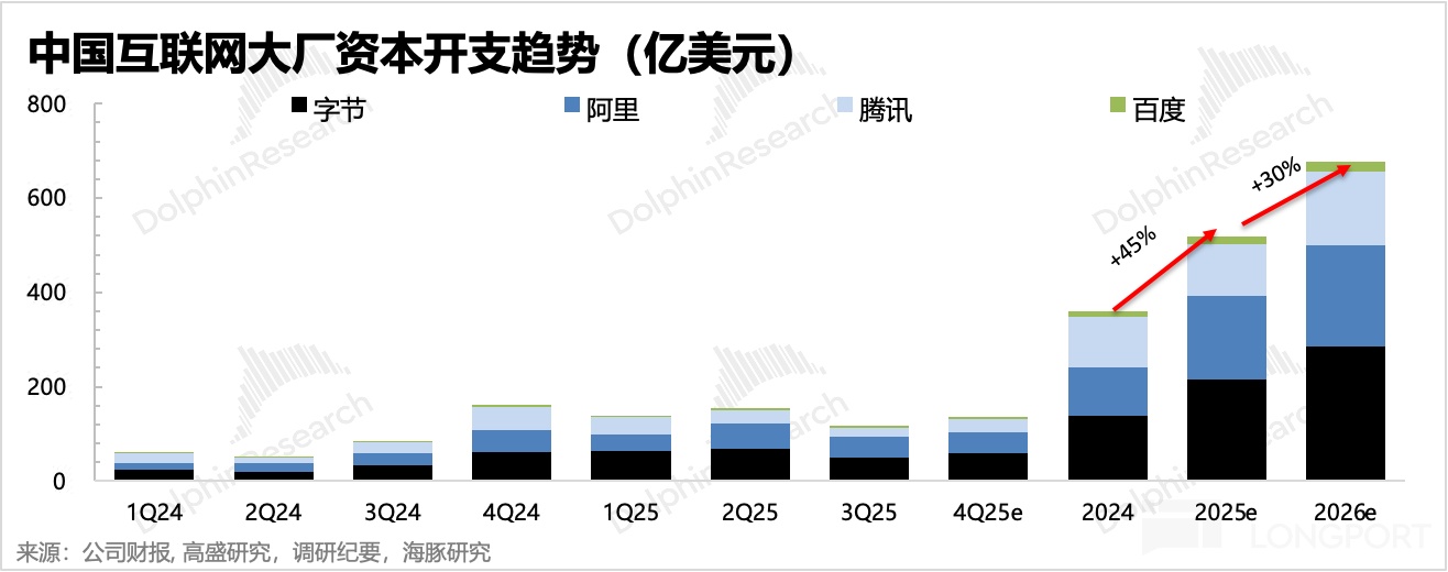 以字节、腾讯、阿里、百度四个大厂为例,2025 年四巨头们的整体资本开支增长 45%,而结合调研数据和市场预期,2026 年预计还将增长 30%。