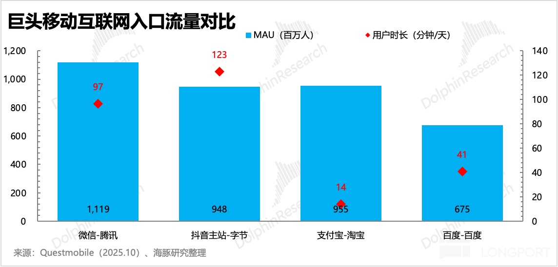 2)百度同样渴求靠 AI 翻身。虽然有手百,符合海豚君对通用入口的定义门槛(手机百度 MAU 7 亿、日均时长为 40 分钟),但其入口低位是肉眼可见的被持续削弱,因此也有寻找替补的需求。