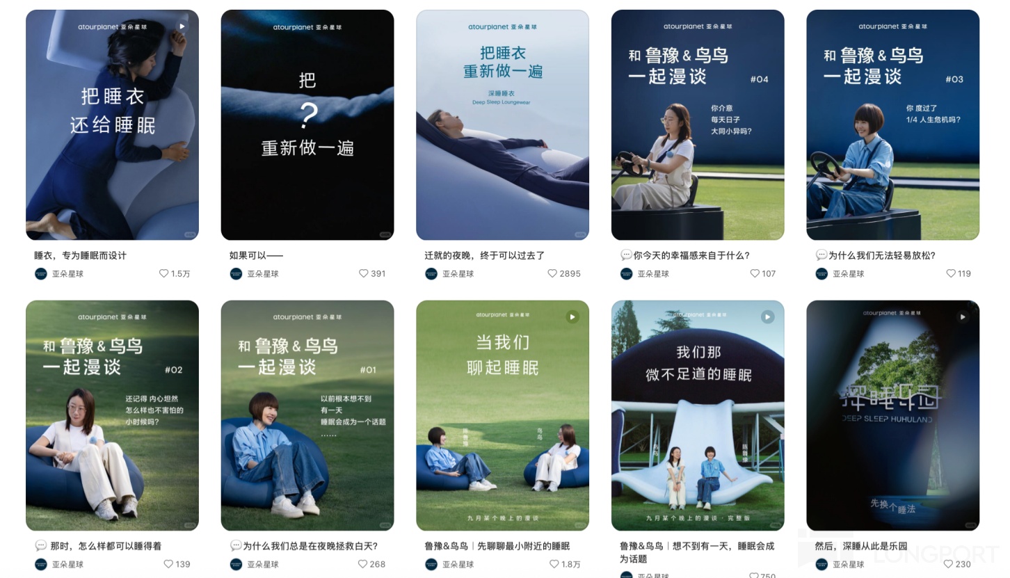 在营销方面,亚朵在抖音、小红书等内容平台聚焦睡眠场景和失眠人群进行流量投放。以小红书为例,亚朵邀请李诞、papi 酱、鲁豫等头部 KOL,以 “深睡体验官”、“颈椎救星” 为话题,通过直播、对话访谈等形式,从生活方式角度深化 “深睡” 理念,强化亚朵星球在睡眠领域的专业心智,吸引了大量用户发布 UGC 内容,形成 “种草 - 拔草” 的社区传播效应。