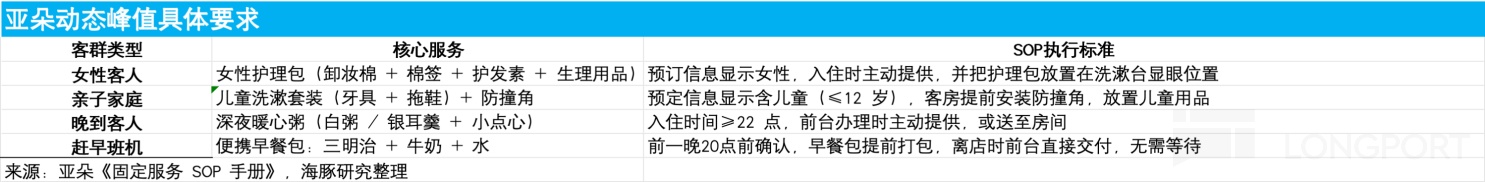 从下图可以看到,固定基础峰值作为亚朵打造自身品牌最核心的体验标识,亚朵要求在所有门店、所有场景,针对所有客户无差别执行。如果对比华住旗下的中高端酒店来看,虽然大堂奉茶、快速退房等服务动作存在相似性,但无论是从服务细节的颗粒度还是落地执行效果上看,亚朵要明显更胜一筹。