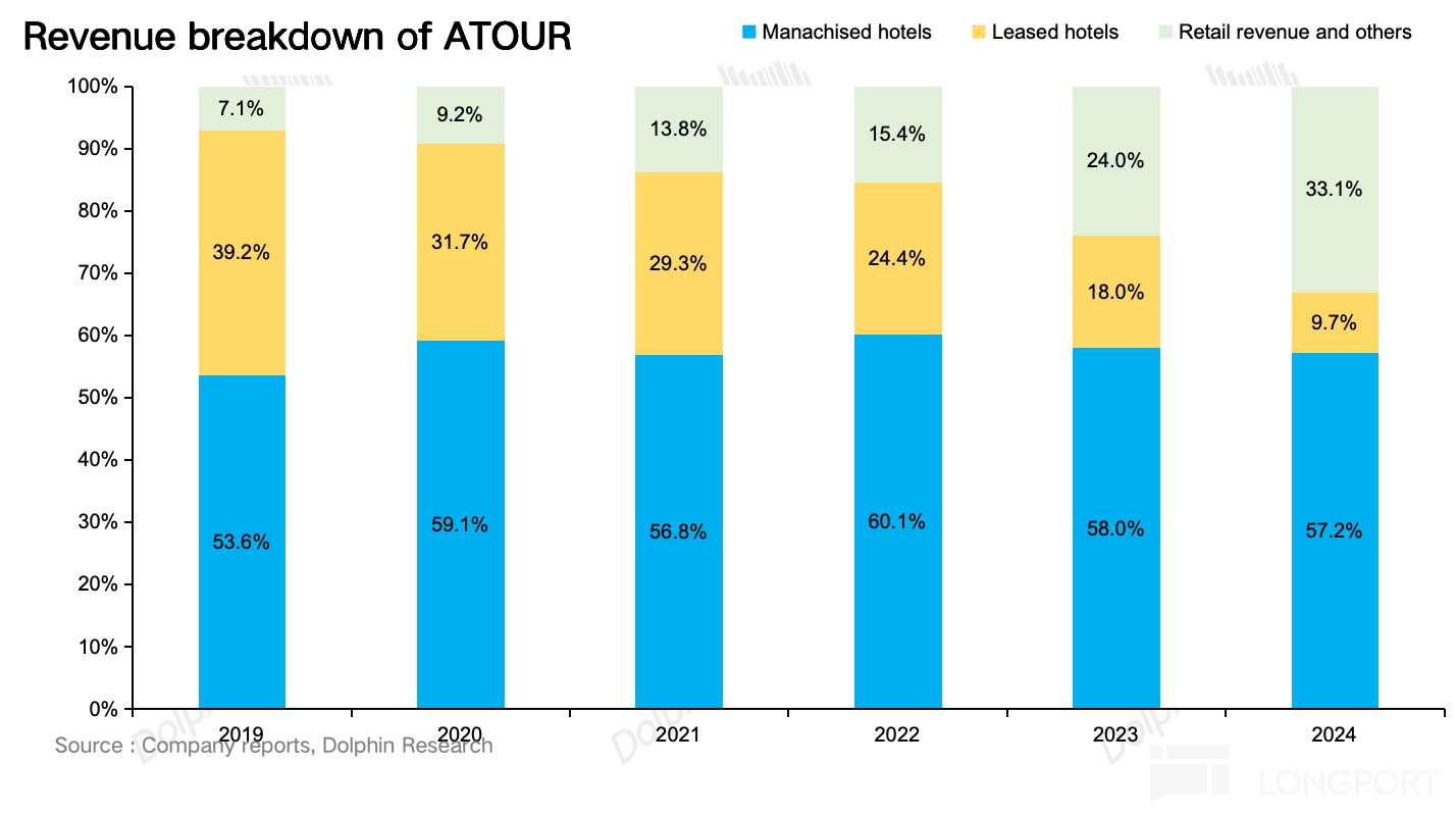 酒店业务:截至 2024 年,亚朵的酒店业务占比 67%。酒店业务又分为加盟和直营,商业模式和华住头部连锁基本一致,其中加盟业务营收占比接近 60%。