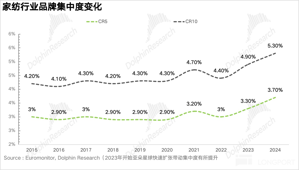 在亚朵推出大单品深睡枕之前,传统家纺行业的枕头普遍以 “支数”(纱线粗细,越高越柔软细腻)、“克重”(单位面积重量,越高越厚实保暖)为两大重要参数,核心原因在于这类指标可以通过产线统一控制,质量稳定、品控简单,因此普遍来说市面上的产品同质化严重,市场集中度极低,没有明星产品,CR5 常年在 5% 以下。