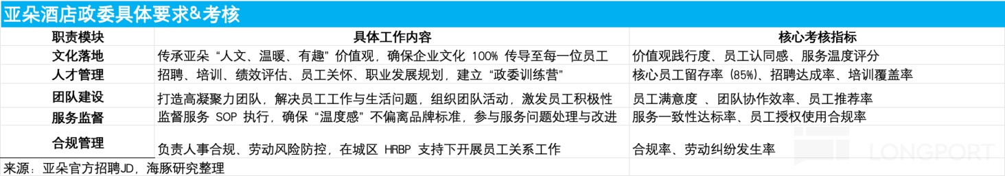 为了服务的稳定落地,亚朵采取双管理者机制,即 “现长 + 政委” 共同驻店,二者均由集团直接派驻,拥有独立汇报线和考核体系: