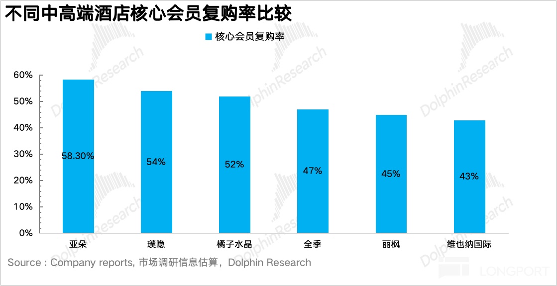 除此之外,这种体验至上的打法,往往也能极大程度上强化客户粘性,培育牢固的核心客群。反映到数据上亚朵核心会员的复购率也要高出行业平均水平 5pct 以上,这些稳固的客群可以让亚朵在行业下行期更具韧性。