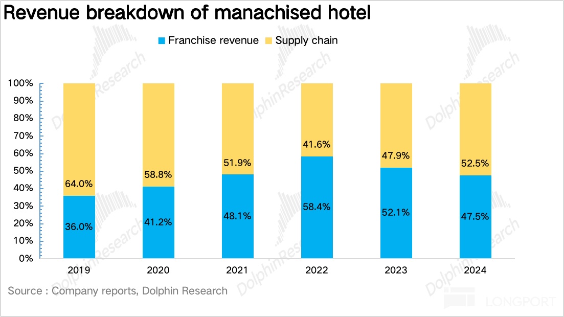 另一部分是为了保障品牌一致性,给加盟商统一提供标准化物资所带来的供应链收入,由于开店筹备期加盟商需要集中购买一次性物资,供应链收入会受到加盟扩张周期的影响,因此相较于特许经营收入来说波动性更大。伴随 2023 年开始亚朵高速开店,可以看到近两年供应链收入占比有所提升。