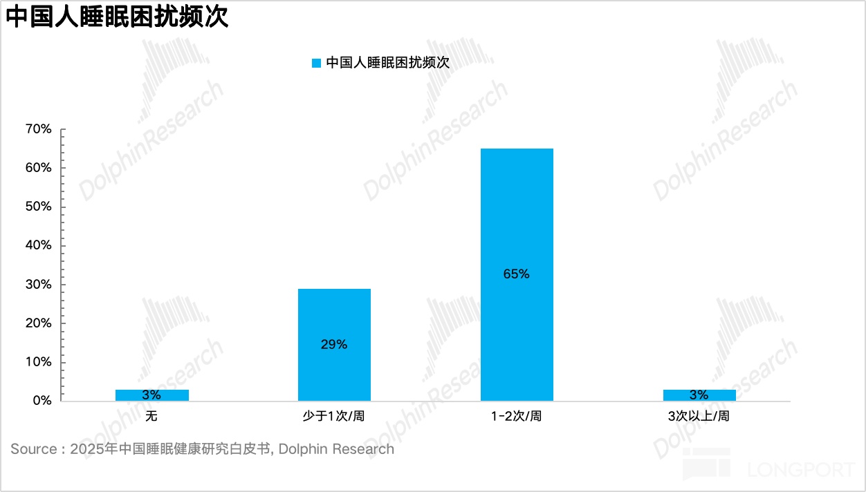 由于现代社会生活节奏加快,工作强度大,睡眠问题愈发凸显。从下图可以看到,根据中国睡眠研究会发布的《2025 中国睡眠健康研究白皮书》,目前我国人群夜间平均睡眠时长为 6.9 小时,65% 的人群每周出现 1-2 次睡眠困扰,且中度和重度困扰人群占比仍在提升。
