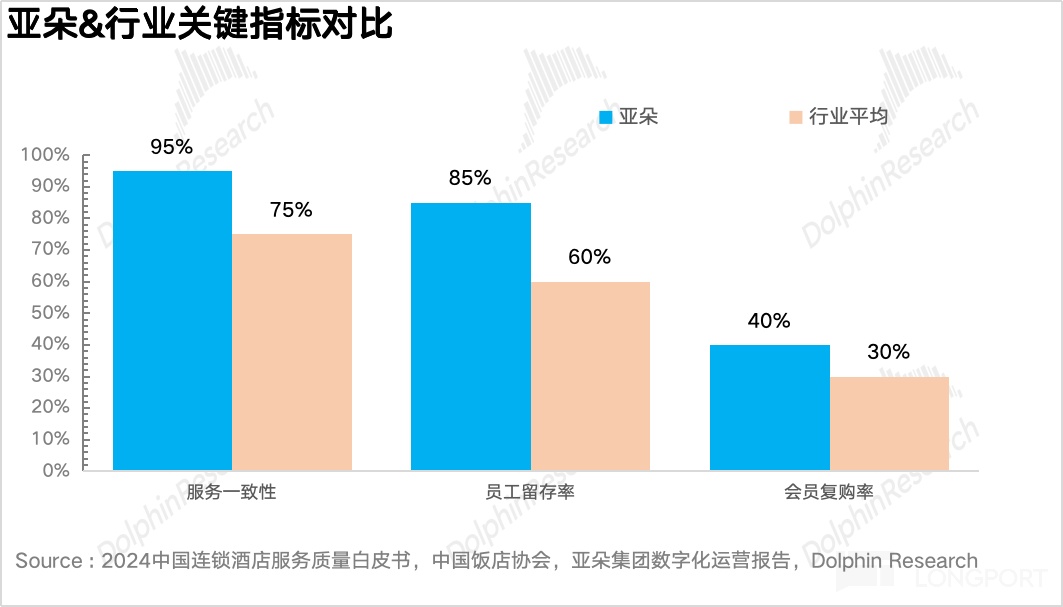 因此,在海豚君看来,政委是亚朵服务体系的 “压舱石”。毕竟,服务业的竞争最终是人的竞争,谁能更好 “激活” 一线员工,谁就能提供更优质的服务,并最终留住客户。因此,政委实际上是从组织层面解决了 “服务如何稳定落地” 的核心难题。根据 2024 年中国连锁酒店服务质量白皮书里的数据,从下图可以看到,亚朵的服务一致性&员工留存率要远高于行业平均水平。