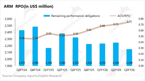 综合以上三项指标来看,ARM 虽然仍保持着 20%+ 的增长,但经营面也出现了一些隐患①下季度版税收入增速大幅回落;②剩余未完成订单(RPO)再次出现下滑。