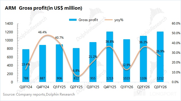 1、主要数据:$Arm(ARM.US) 本季度实现收入 12.4 亿美元,同比增长 26%,符合市场预期(12.3 亿美元)。公司本季度收入端环增的 1 亿美元中,主要来自版税业务的增长贡献。公司毛利率为 97.6%,维持在 97% 以上的高位。