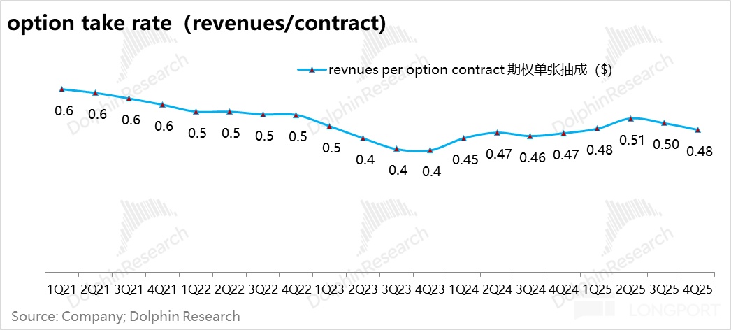 四季度罗宾汉正股交易量环增 10%,超市场整体 5% 的环比增幅;变现率仍然以 PFOF 为主,稳在 1.32 个基点,创收 9400 万,正股部分变现率仍然很低。