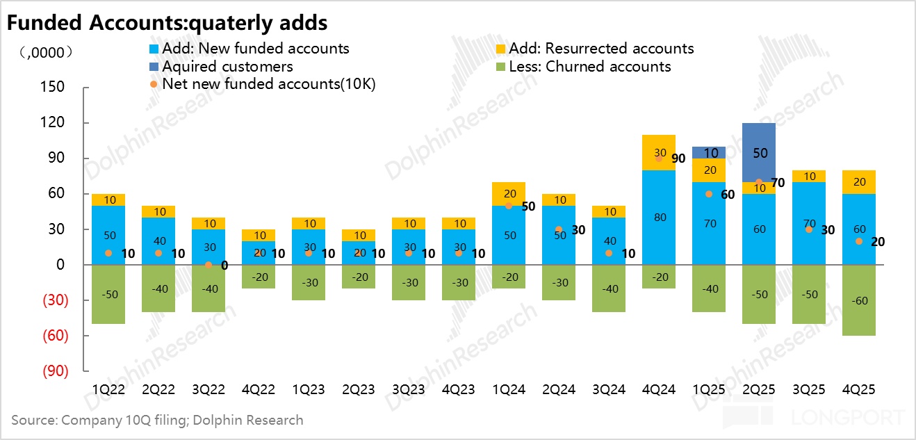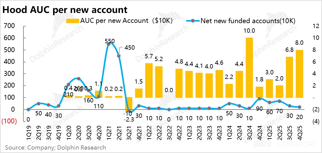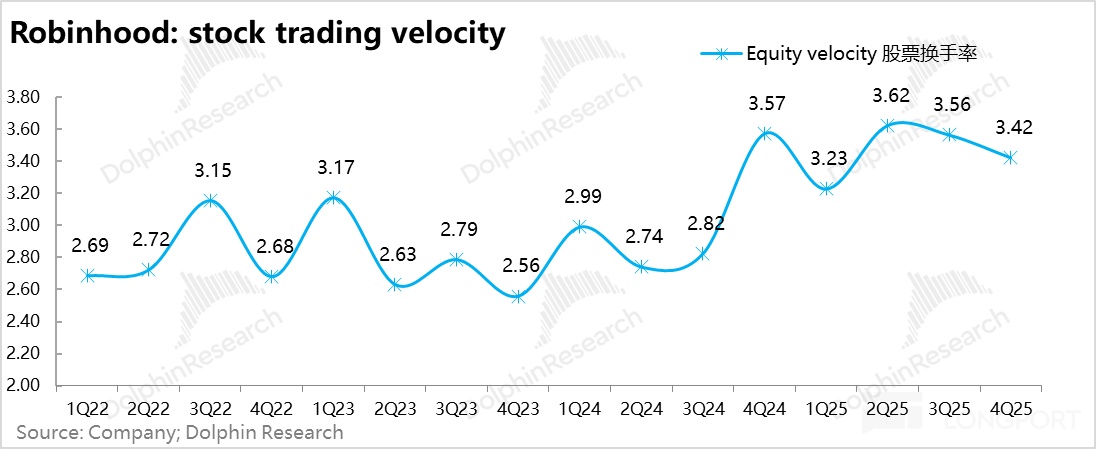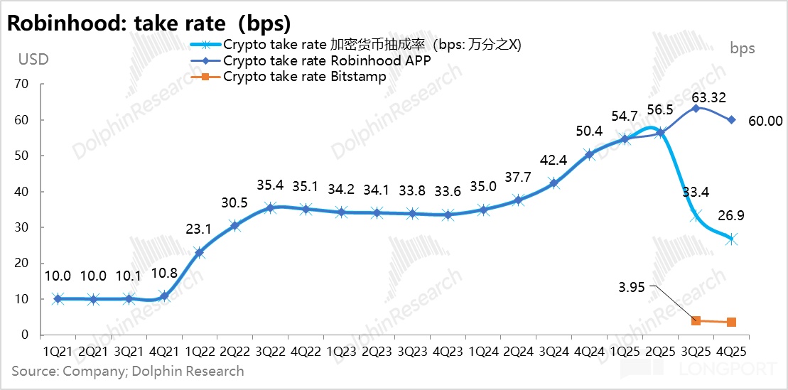 从 24 年下半年到 2025 年结束,HOOD 虚拟资产变现率已经一路从 35bps 拉到了 60bps。目前按照大行预期,Robinhood 变现率拉升的高点,大约也就是 70 个基点上下,虚拟货币的变现拉升期事实上应该已接近尾声。