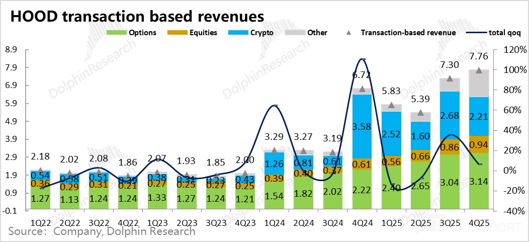 最终,公司总体的交易类收入单季达到了 7.8 亿,超出上季度的 7.3 亿。这里超出上季度的收入其实主要来自于其他收入 1.5 亿(预测市场、提现、期货等),直接环比翻倍。