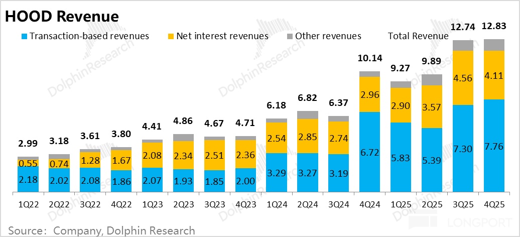 从交易流水角度,行业四季度交易流水环比下跌 9%,Robinhood APP 下跌了 14%,在上涨行情中,作为散户平台 HOOD 有更高的上涨弹性,在下跌的时候,交易量跌幅也更高。