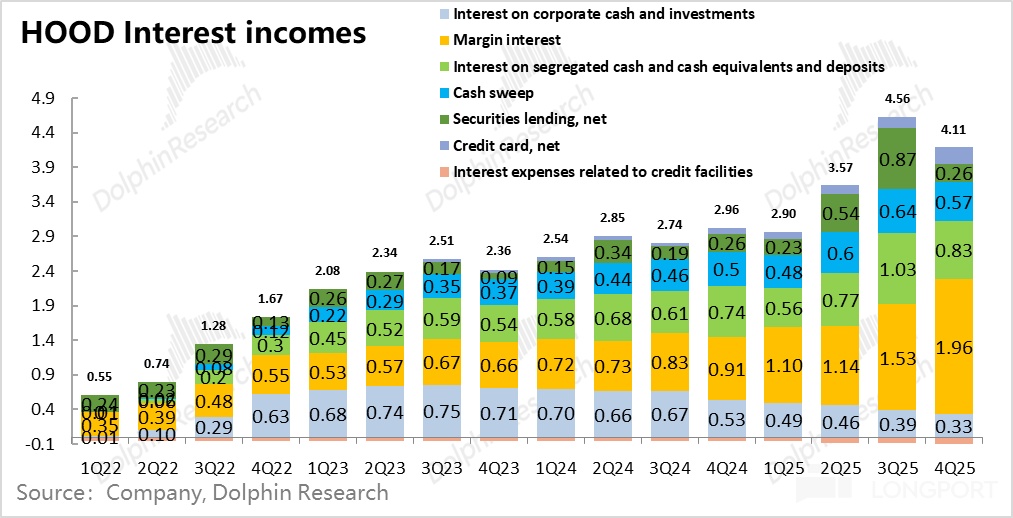 以上三项收入,再加上现金扫存(用户把闲钱通过 HOOD 平台购买外部银行理财)与公司自有资金利息收入,合计接近 4.1 亿美金,环跌 10%,主要是因为融券业务大幅低于市场预期。