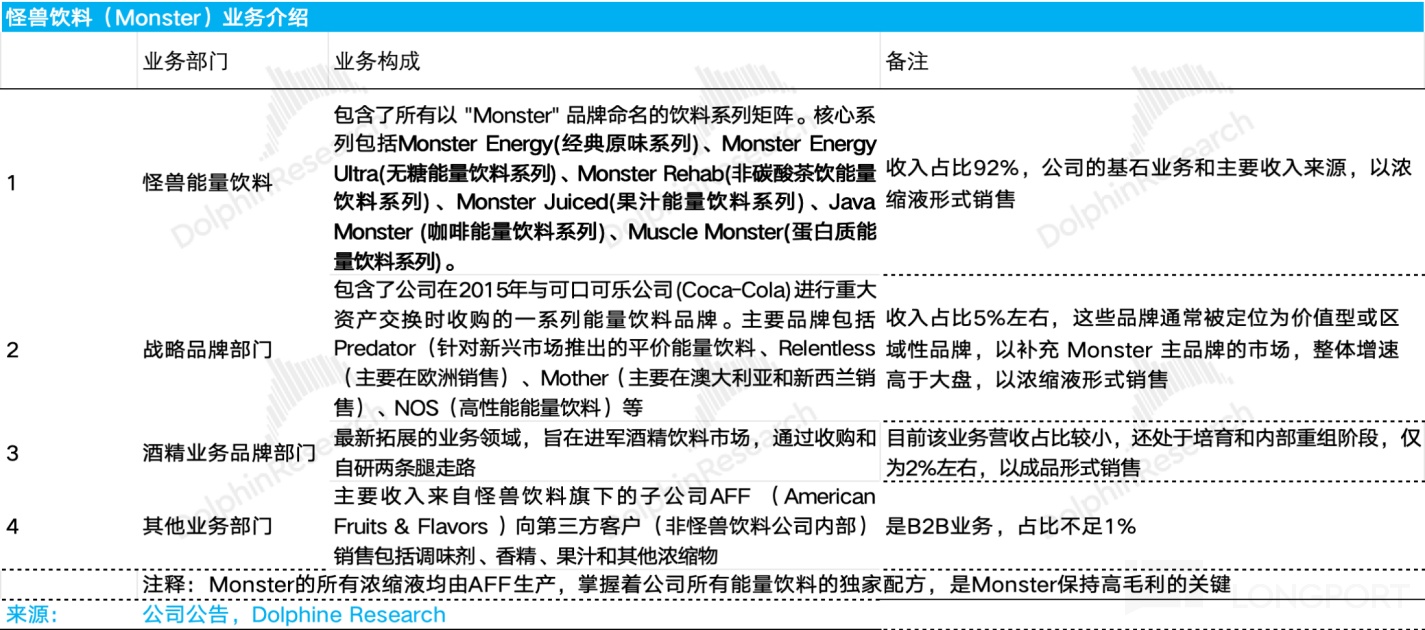 根据 Monster 的官方披露口径,公司营收增长可以拆解为怪兽饮料,战略品牌、酒精业务品牌和其他业务四大部门,其中: