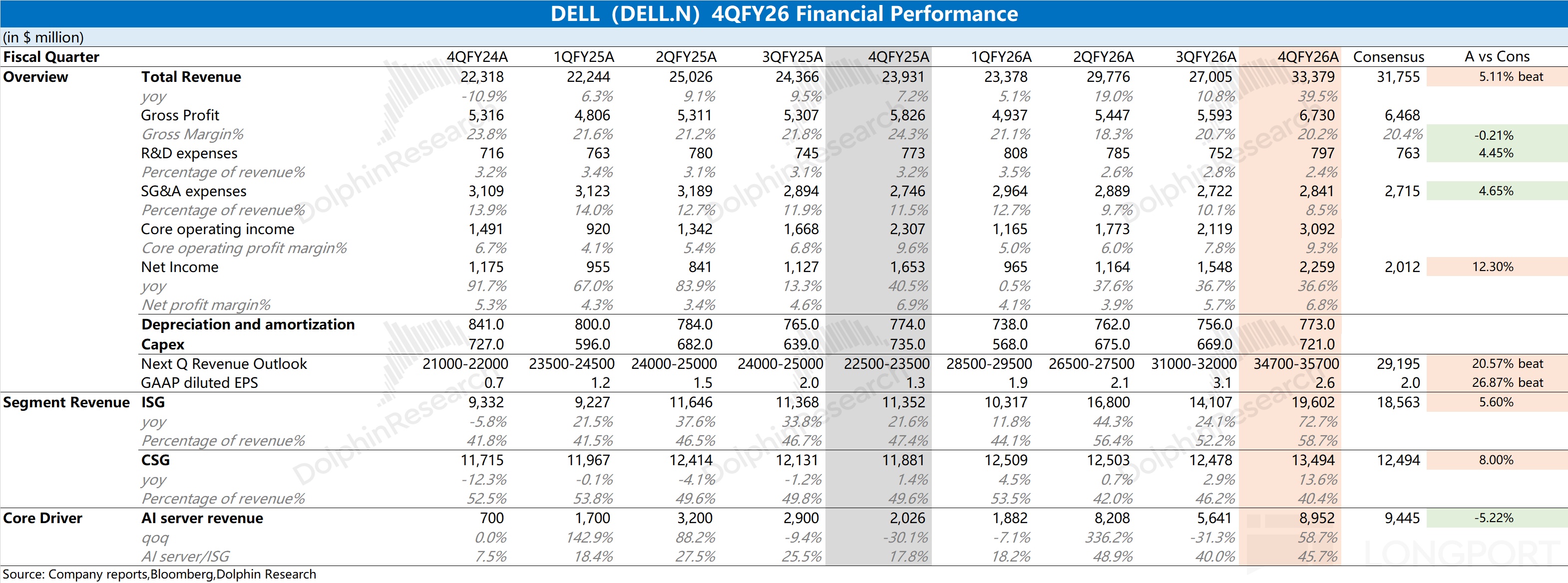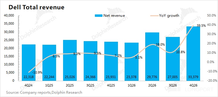 戴尔 DELL 在 2026 财年第四季度(即 25Q4)实现营收 333.8 亿美元,同比增长 39.5%, 好于市场预期(318 亿美元)。公司本季度环比增长 64 亿美元,来自于 ISG 业务(基础设施解决方案)和 CSG 业务(客户端解决方案)两业务的双双带动,其中 AI 收入环增 33 亿美元。