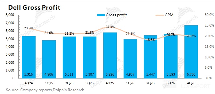 戴尔 DELL 在 2026 财年第四季度(即 25Q4)实现毛利 67.3 亿美元,同比增长 15.5%。