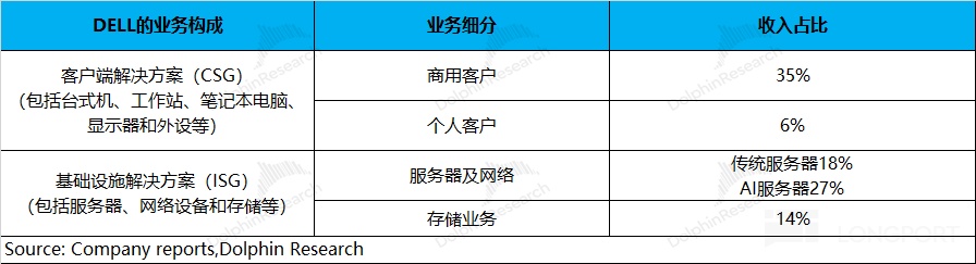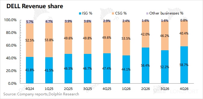 从戴尔 DELL 的分业务情况看,在 AI 服务器增长的带动下,公司的 ISG 业务(基础设施解决方案)呈现提升的趋势,本季度占比达到了 58.7%。