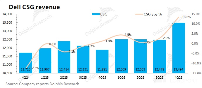 戴尔 DELL 的 CSG 业务在 2026 财年第四季度(即 25Q4)实现营收 135 亿美元,同比增长 13.6%, 好于市场预期(125 亿美元)。